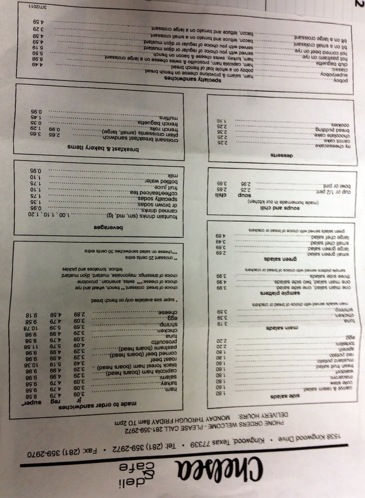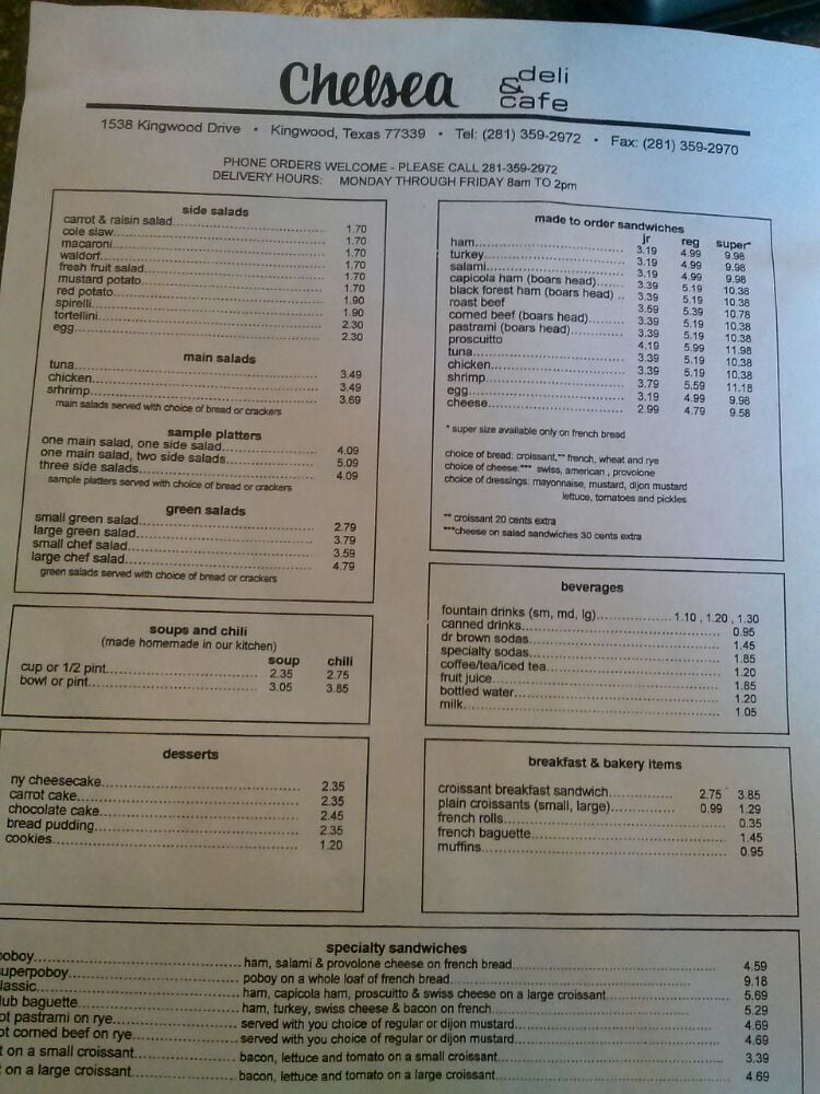 Chelsea Deli & Cafe is a charming local gem located in Kingwood, TX. Known for their delicious chicken salad sandwiches and flavorful potato salad, this cafe offers a variety of quality ingredients in their menu. Customers rave about the fast and friendly service, with favorites like the BLT on a croissant and the hot corned beef sandwich standing out. The half sandwich option is perfect for those looking for a lighter meal, while the catering services are ideal for parties and events. Whether you're a long-time patron or a first-time visitor, Chelsea Deli & Cafe will make you feel right at home with their comforting soups, delectable deli options, and cozy atmosphere. Make sure to stop by and indulge in the flavors of this beloved neighborhood spot.